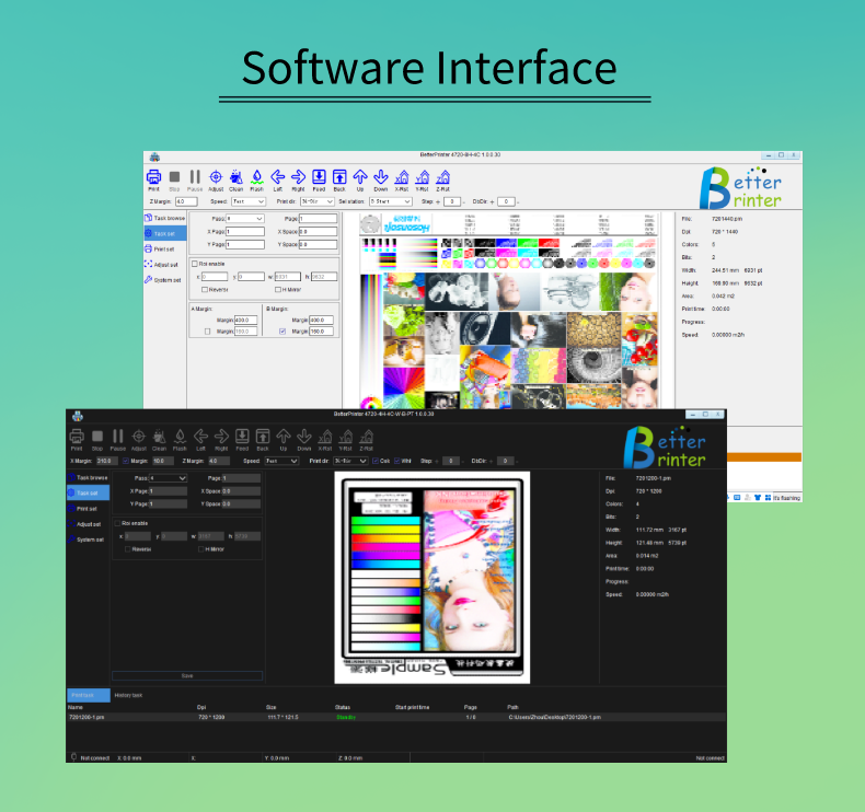 Provide various nozzle arrangements and spot color settings, such as staggered (splicing) full color, white color out, side by side, 8 colors side by side (kcmy+4 spot colors), etc.